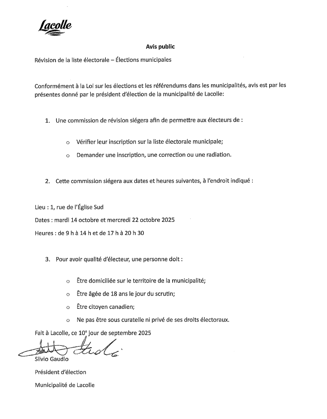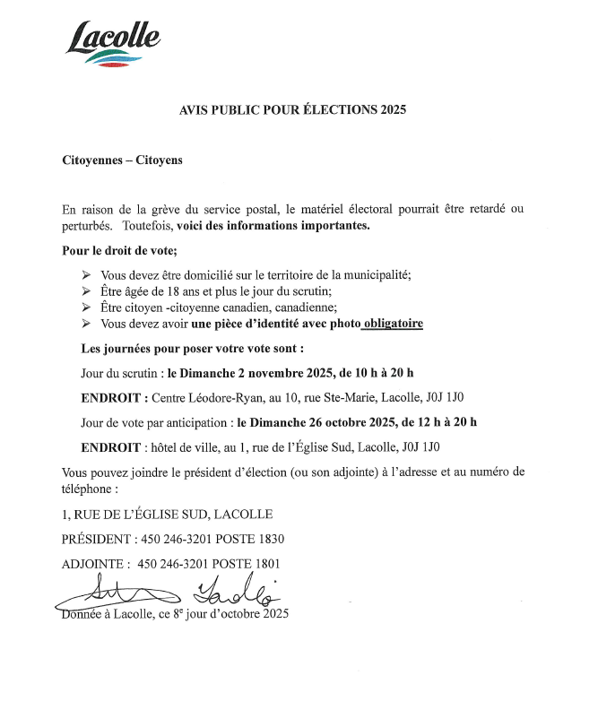 La Loi sur les élections et les référendums dans les municipalités prévoit des élections générales municipales dans toutes les municipalités de la province, tous les quatre ans, le premier dimanche de novembre. Pour toute information supplémentaire vous pouvez consulter la page d’Élections Québec ICI!